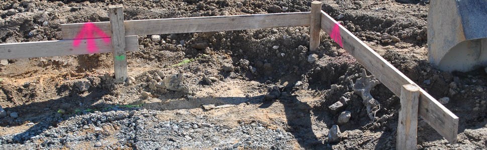 Nach erfolgtem Baugrubenaushub wird das geplante Gebäude gemäß der Baugenehmigung „feinabgesteckt“.Die Gebäudeaußenkanten werden auf Schnurgerüste übertragen und mit Nägeln kenntlich gemacht.